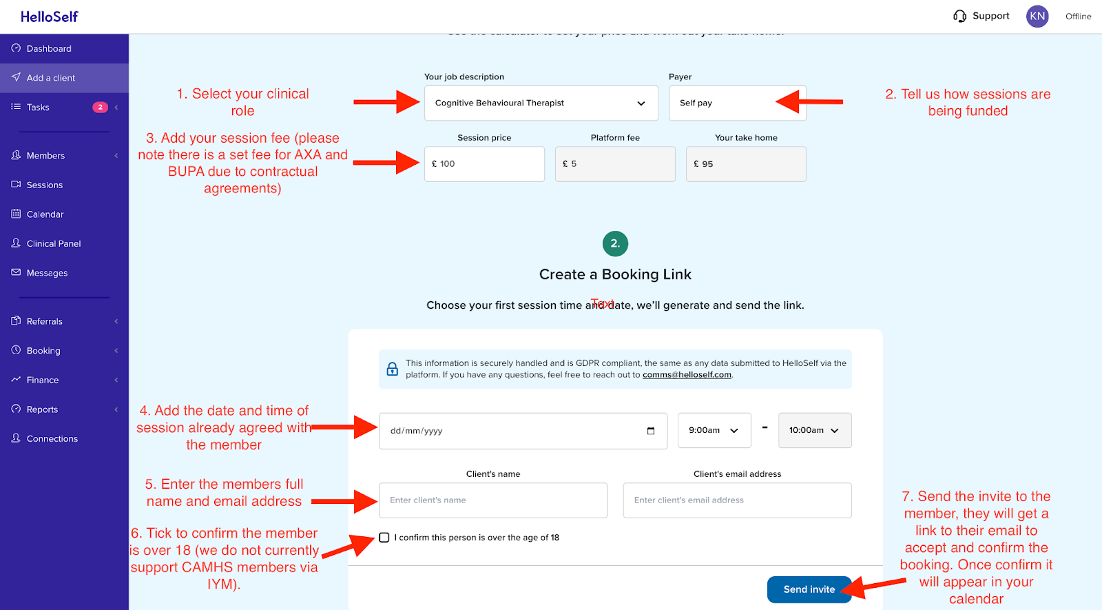 3. Send the invite to your member. They will receive an email with a link within it. The member clicks the link and will be brought to the HelloSelf member platform to log in and complete their personal details. ** It is essential the member does this in order for the session to be confirmed and booked into your calendar.